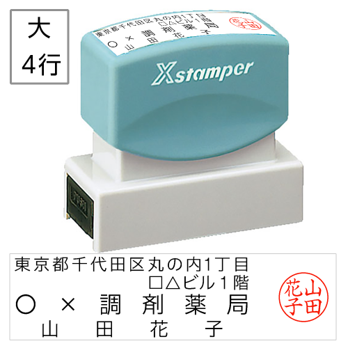 処方箋の保険薬局所在地および名称、保険薬剤師氏名に加えて、認印も1回で押印できる便利なスタンプです。